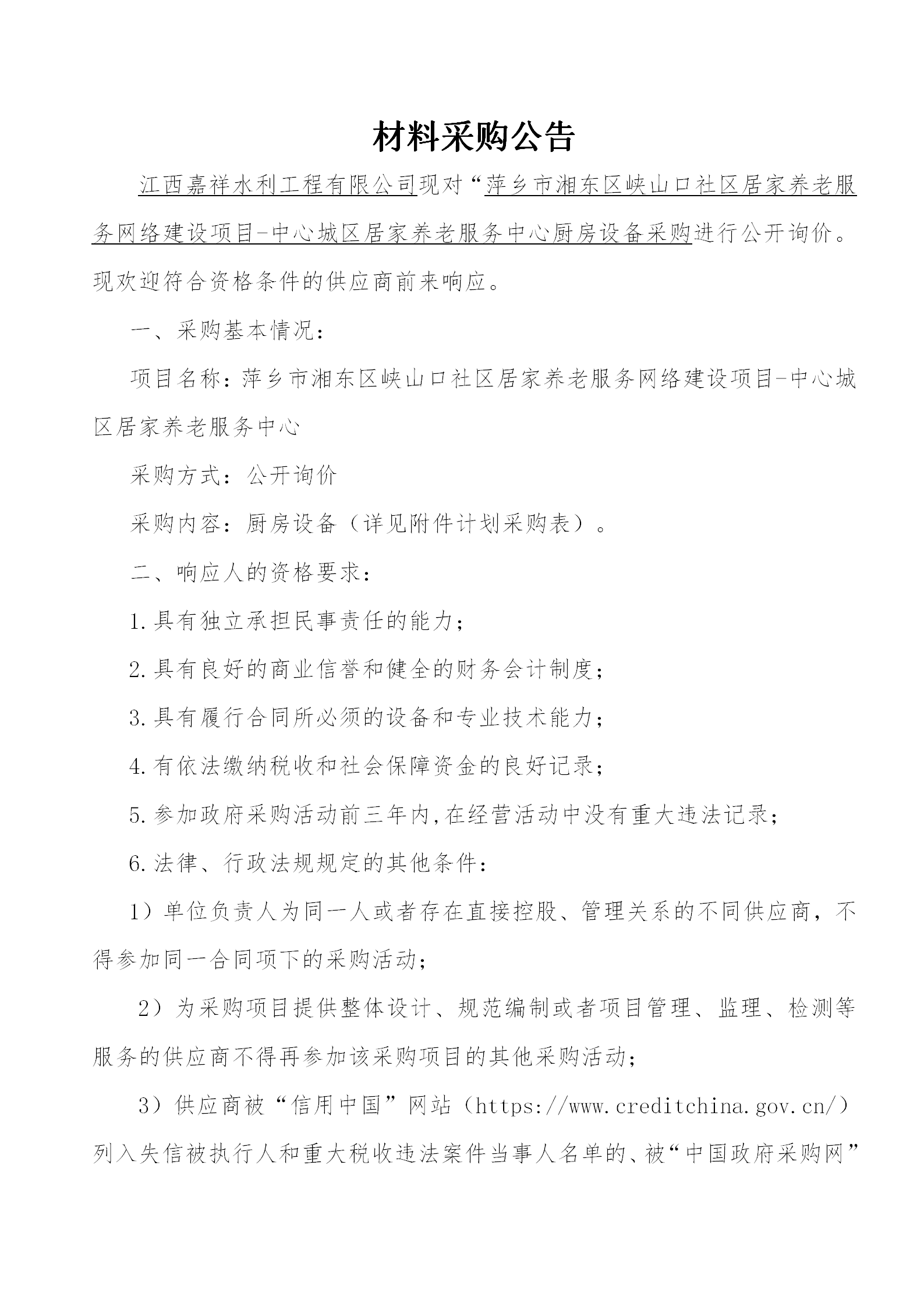 江西嘉祥水利工程有限公司現(xiàn)對(duì)“萍鄉(xiāng)市湘東區(qū)峽山口社區(qū)居家養(yǎng)老服務(wù)網(wǎng)絡(luò)建設(shè)項(xiàng)目-中心城區(qū)居家養(yǎng)老服務(wù)中心采購(gòu)進(jìn)行公開詢價(jià)?,F(xiàn)歡迎符合資格條件的供應(yīng)商前來響應(yīng)。