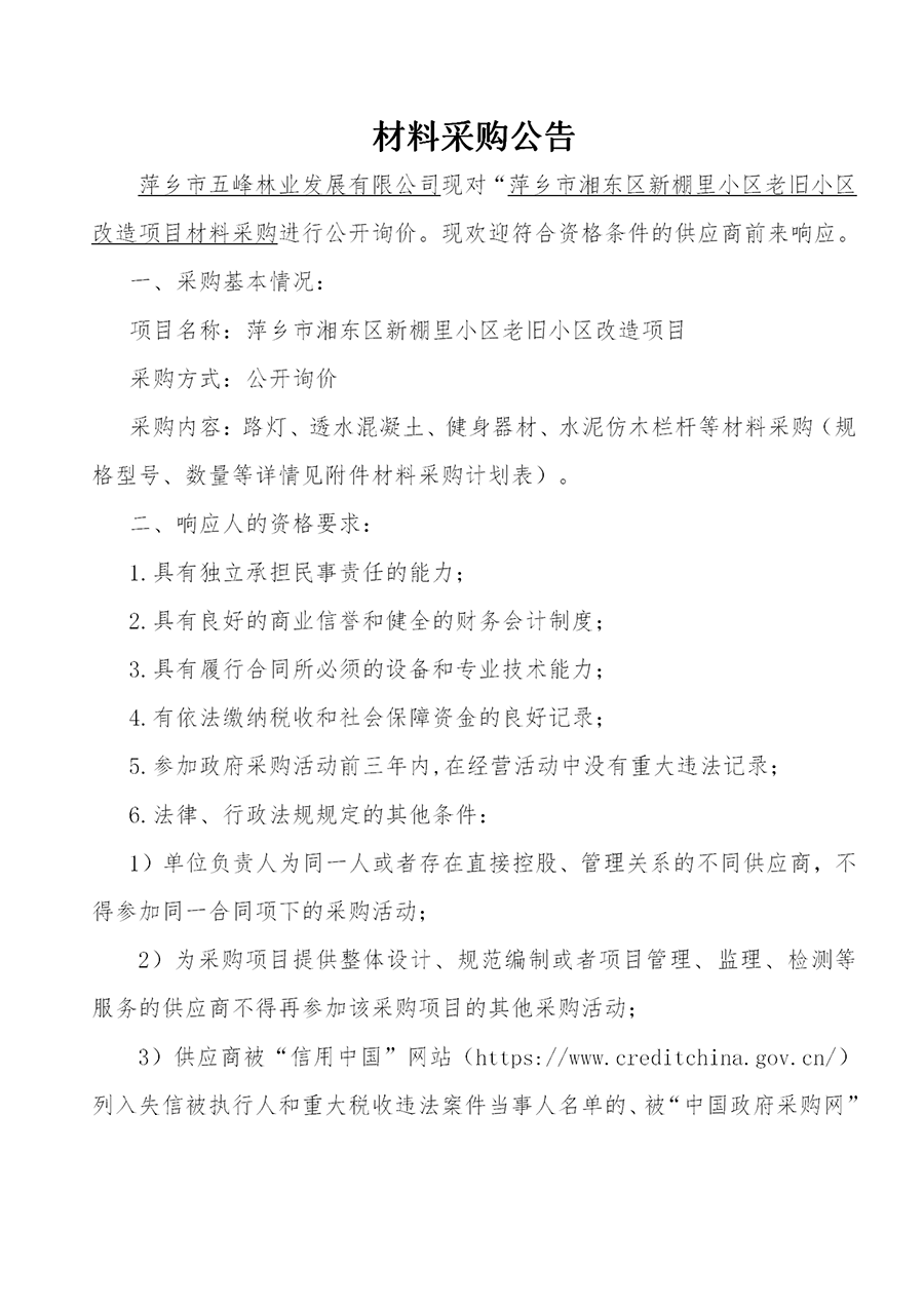 萍鄉(xiāng)市五峰林業(yè)發(fā)展有限公司現(xiàn)對(duì)“萍鄉(xiāng)市湘東區(qū)萍電片區(qū)排水防澇能力提升項(xiàng)目材料采購(gòu)進(jìn)行公開(kāi)詢價(jià)?,F(xiàn)歡迎符合資格條件的供應(yīng)商前來(lái)響應(yīng)。