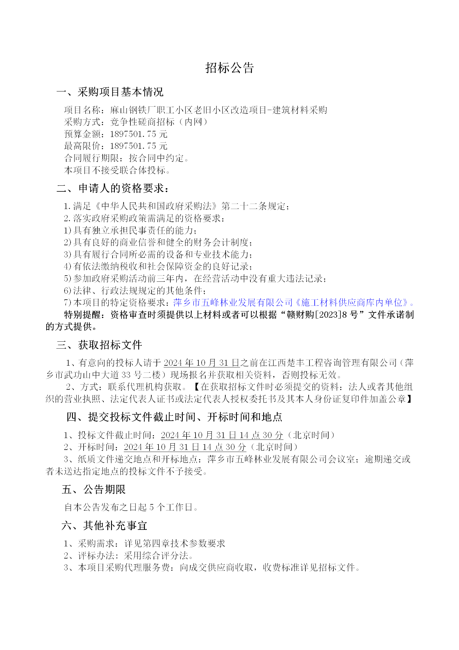 萍鄉(xiāng)市五峰林業(yè)發(fā)展有限公司現(xiàn)對(duì)“萍鄉(xiāng)市湘東區(qū)新棚里小區(qū)老舊小區(qū)改造項(xiàng)目材料采購(gòu)進(jìn)行公開詢價(jià)?,F(xiàn)歡迎符合資格條件的供應(yīng)商前來響應(yīng)。